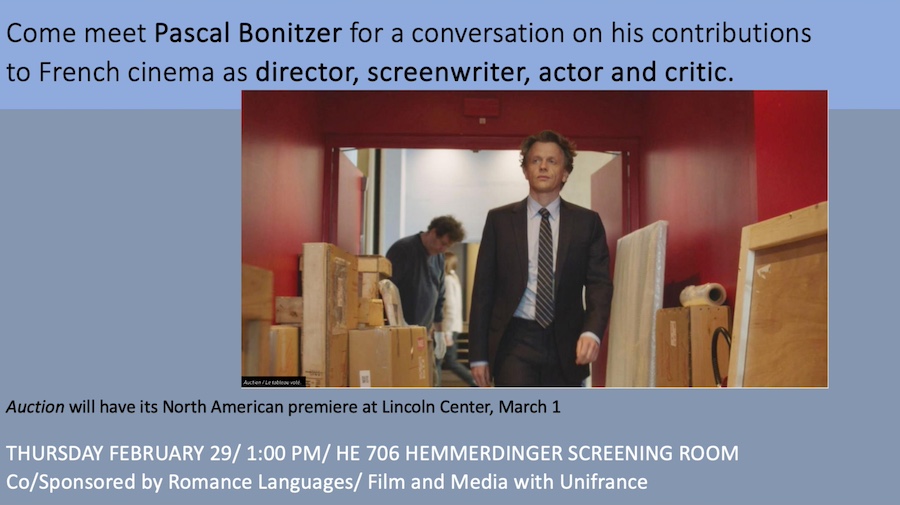 Pascal Bonitzer (director of 11 features); screenwriter and collaborator of more than 10 of Jacques Rivette’s masterpieces, among other collaborations with Andre Téchiné, Raoul Peck, Raul Ruiz, etc,; and Cahiers du Cinéma Critic for many years, came for a Q&A with professors Sam DiIorio (Romance Languages) and Ivone Margulies (Film and Media). The discussion with the multi-talented Bonitzer was fantastic.