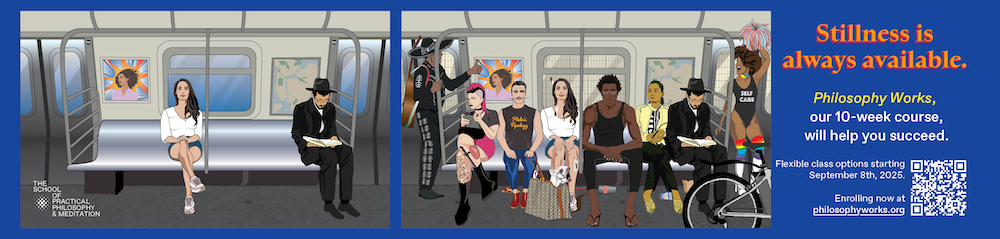 Prof. Miranda created the new fall advertisement campaign for The School of Practical Philosophy & Meditation.  His design and illustration are now circulating in the subway cars, accompanied by the catch phrase “Stillness is always available,” conceived by IMA alum Alex Mallis.