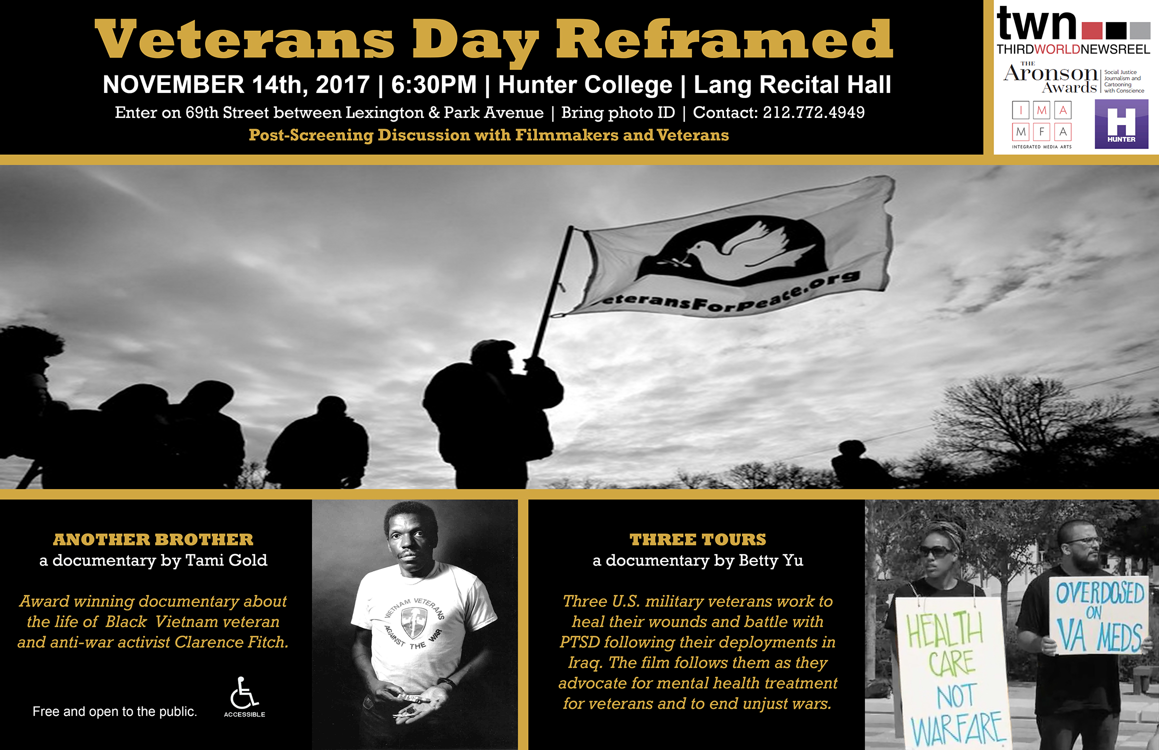 Veteran’s Day Reframed will screen two films that follow U.S. military veterans returned from two different wars – the Iraq war and the Vietnam war – suffering from the trauma of their service, and becoming activists and advocates for peace and treatment for veterans. There will be a post-screening discussion with the Filmmakers and Veterans.
