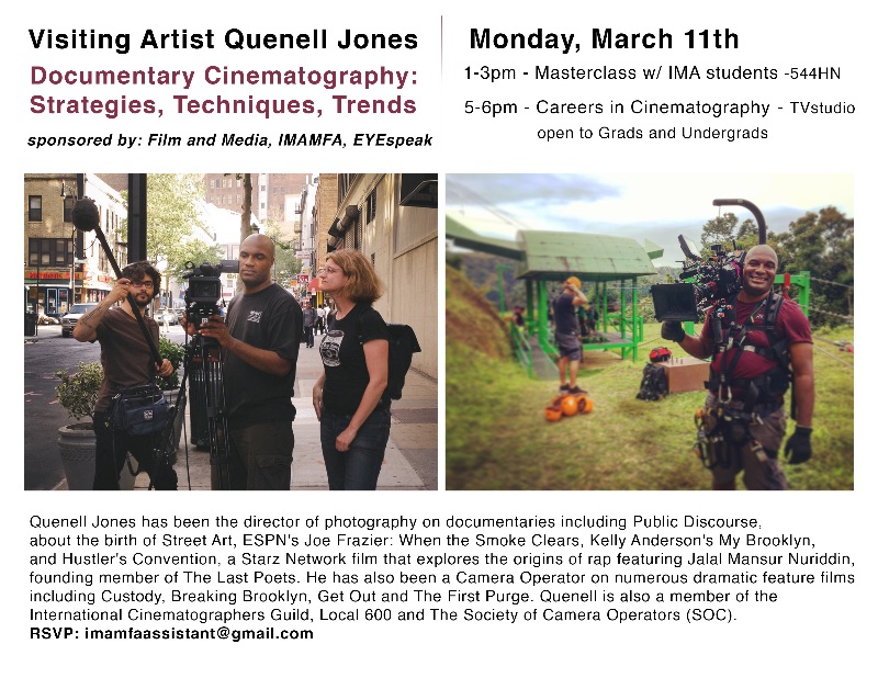 Interested in cinematography? Visiting Artist: Cinematographer Quenell JonesMarch 11th 1-3PM | HN 544 | RSVP to imamfaassistant@gmail.com 5-6PM | HN 436 TV Studio | RSVP to kellyjmanderson@gmail.com photo by: Natalie Conn See more pictures from the event. posted on March 5, 2019 ← Previous post Next post →