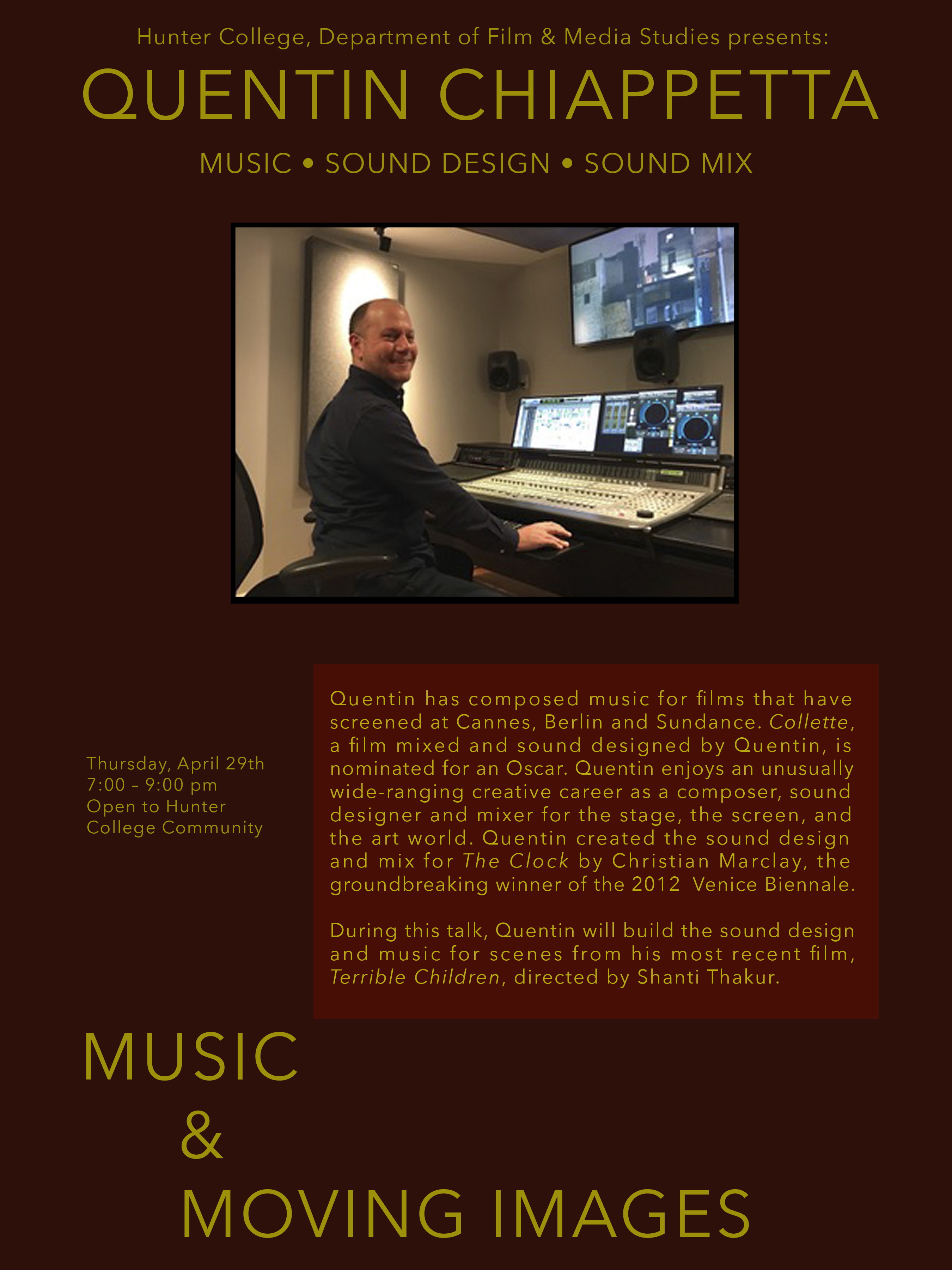 Quentin is an award-winning, classically trained composer and sound designer with years of experience scoring for every type of media, from television and film, to theater and VR. He has scored dozens of feature films and documentaries, many screening in Sundance, Cannes and Berlin. Quentin is a sought-after collaborator for ground-breaking video installations, including Christian Marclay’s The Clock, winning the 2012 Venice Biennale. Quentin will share his creative process, using his work as examples.