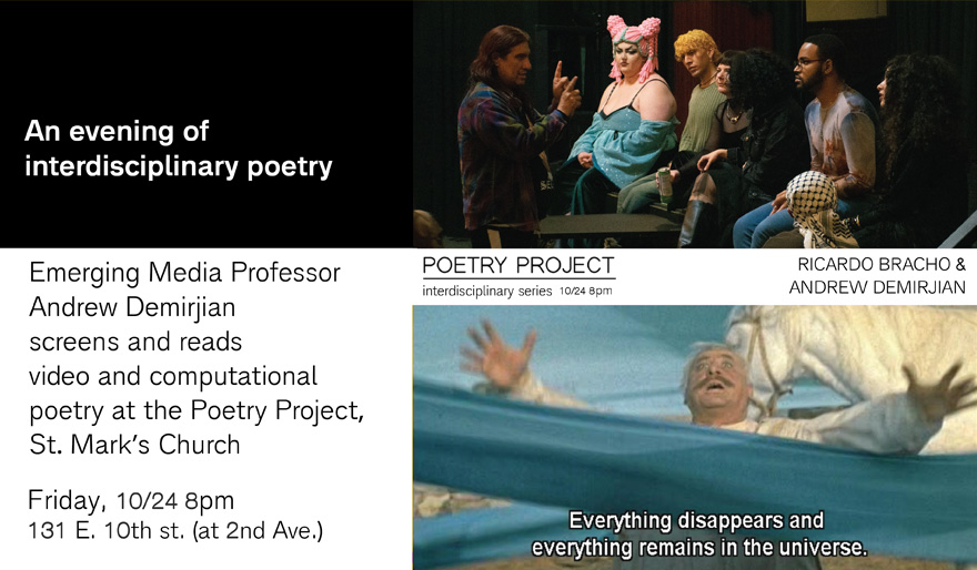 Friday, Oct. 24th 8PM – Emerging Media Prof. Andrew Demirjian will be screening and reading his video and computational poetry at the Poetry Project. The program includes playwright Ricardo Bracho, UPenn Abrams Artist in Residence, and is part of their interdisciplinary Poetry Series, at St. Mark’s Church, 131 E. 10th St. (at 2nd Ave.)