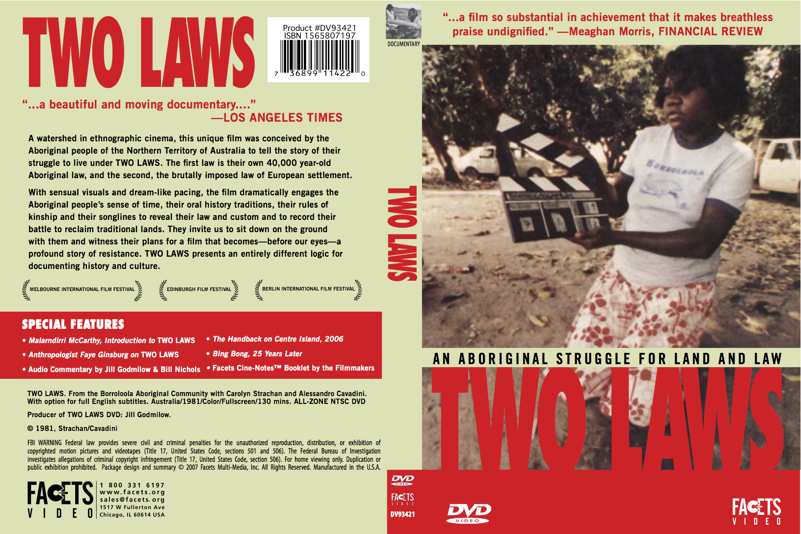 With sensual visuals and dream-like pacing, the film dramatically engages the Aboriginal people’s sense of time, their oral history traditions, their rules of kinship and their songlines to reveal their law and custom and to record their battle to reclaim traditional lands. They invite us to sit down on the ground with them and witness their plans for a film that becomes—before our eyes—a profound story of resistance. TWO LAWS presents an entirely different logic for documenting history and culture.