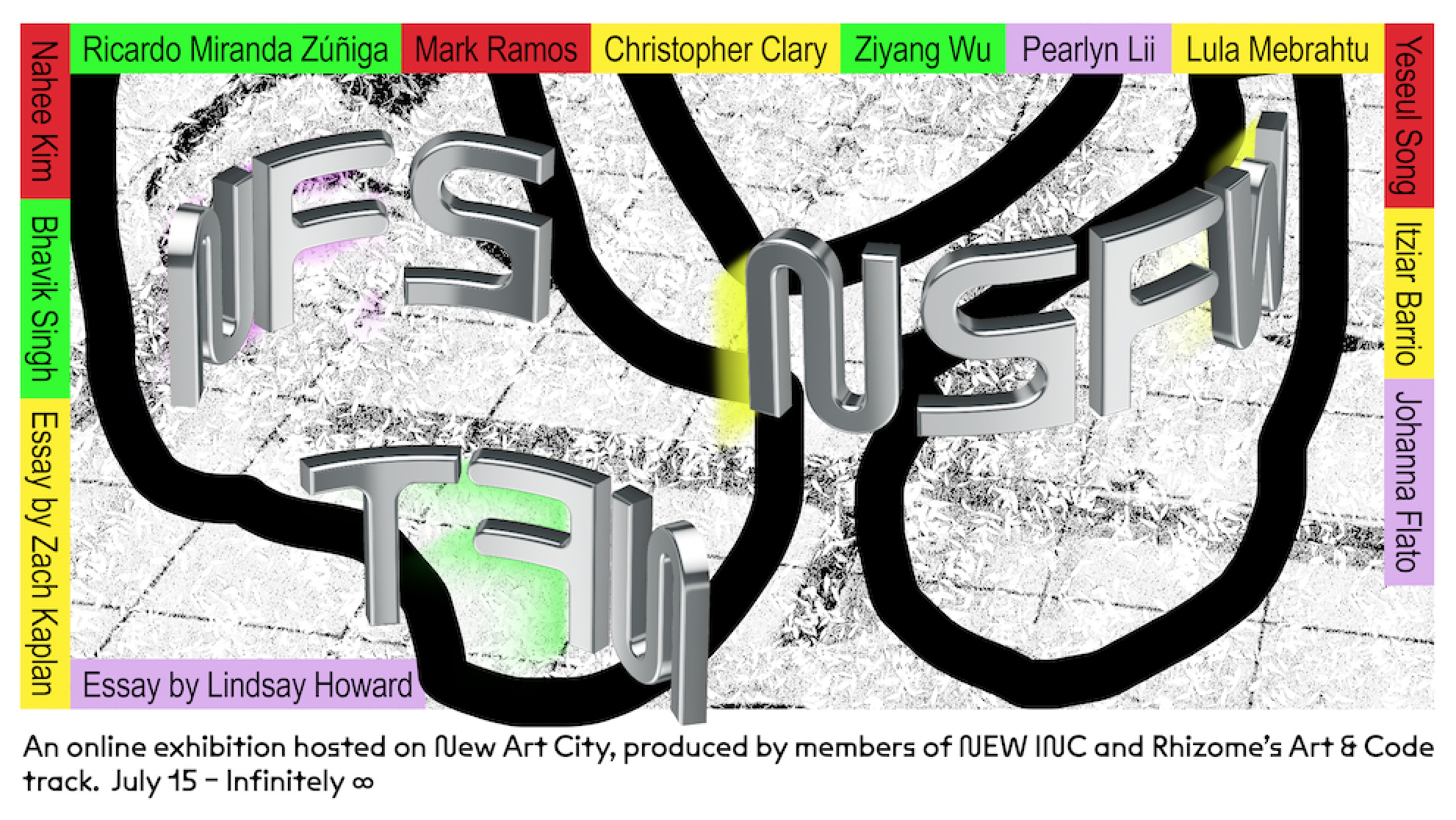 NFS NSFW NFT is a 3D virtual exhibition produced by members of NEW INC and Rhizome’s Art & Code track. The exhibition is on New Art City, hosting a Zoom opening, minting a NFT on Foundation, and closing with a panel at Hunter College — all, to explore the critical poetics of this particular not-for-sale, not-safe-for-work, and non-fungible-token moment. The exhibition is composed of three galleries: